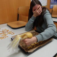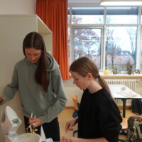 Bewaffnet mit allerlei Backzutaten und natürlich guter Laune machten wir uns am 15.12. auf die Suche nach einem Raum, in dem wir backen konnten. Das gestaltete sich allerdings schwieriger als gedacht. Der Seminarraum in der Turnhalle war belegt und in der Aula probte das Orchester. Nach einiger Zeit verkündete Herr Jahn: „Raum 224“, der sich leider als Klo entpuppte. Mit dem Raum 222 fanden wir schließlich doch ein Zimmer, das unseren Ansprüchen entsprach 🙂