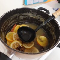 - 2l Apfelsaft, geschnittene Zutaten, 2 Zimtstangen und Sternanis in einen Topf geben