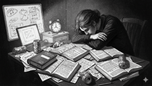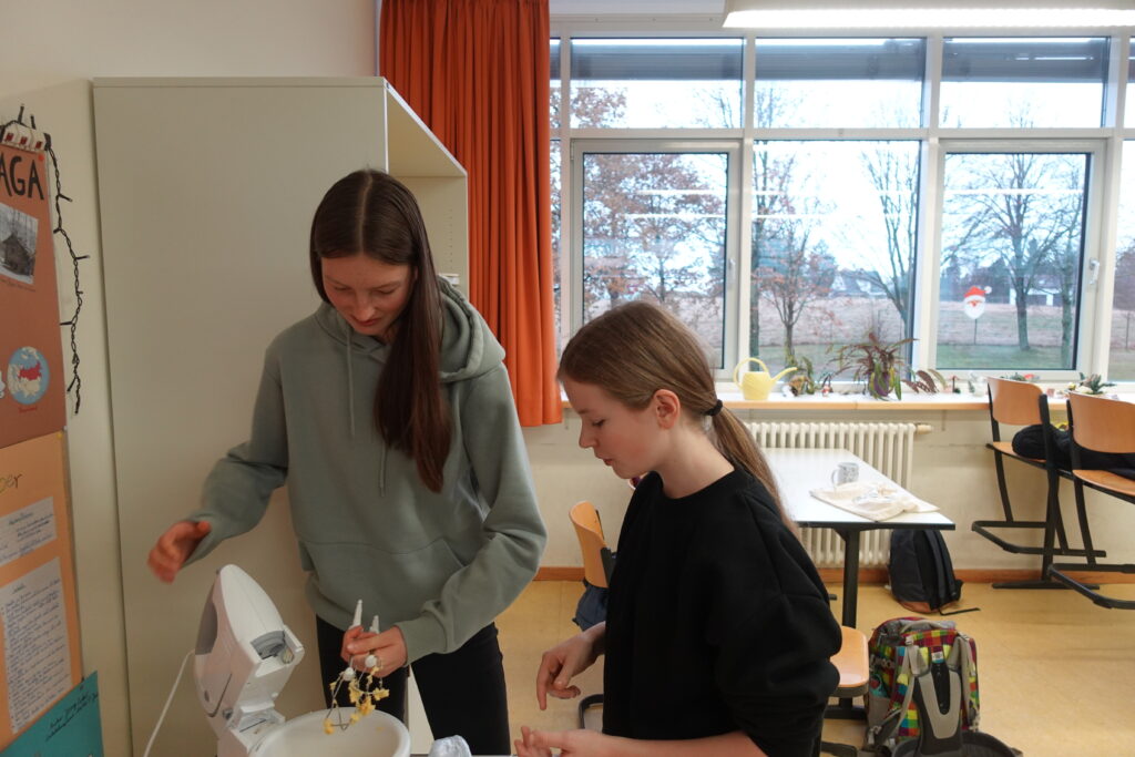 Bewaffnet mit allerlei Backzutaten und natürlich guter Laune machten wir uns am 15.12. auf die Suche nach einem Raum, in dem wir backen konnten. Das gestaltete sich allerdings schwieriger als gedacht. Der Seminarraum in der Turnhalle war belegt und in der Aula probte das Orchester. Nach einiger Zeit verkündete Herr Jahn: „Raum 224“, der sich leider als Klo entpuppte. Mit dem Raum 222 fanden wir schließlich doch ein Zimmer, das unseren Ansprüchen entsprach 🙂