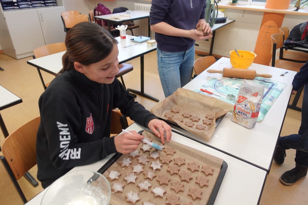 Als schließlich alles aus dem Ofen kam und sich auf den Tischen stapelte fiel uns auf: Wir können das gar nicht alles essen. Deshalb wurden kurzerhand alle leeren Brotbüchsen, Schüsseln und Tassen mit Zimtsternen und Spritzgebäck befüllt.