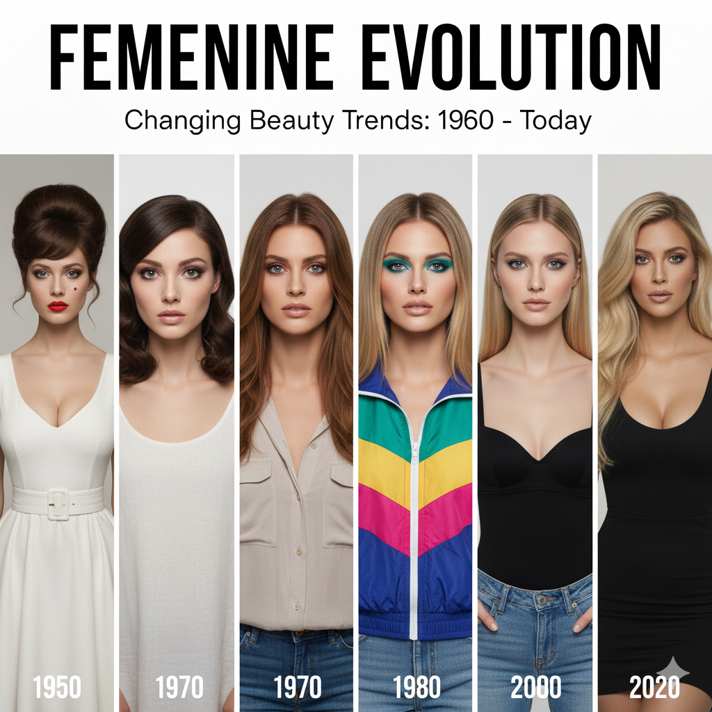1950: Der Körper der Frau sollte nach den Kriegsjahren voluminöse Kurven haben. Marylin Monroe war mit ihrer ,,Sanduhrfigur” sehr angesagt. ,,Mehr ist Mehr” prägte diese Zeit besonders. Die Sanduhrfigur bestand aus einer großen Oberweite, einer schmalen Taille und einer breiten Hüfte. Die angestrebten Konfektionsgrößen (Größen der modernen Kleidung) bei einer erwachsenen Frau waren 40 und 42. Das Makeup der Frauen in den 50er Jahren beinhaltete dicke Augenbrauen, rote Lippen, dunklen Lidschatten (leichtes smokey eye) und voluminöse Wimpern. Kleine Muttermale waren auch sehr ,,in”, weshalb sich manche Frauen eines über den Mundwinkel gemacht haben. Die Haare waren sehr voll, aber mussten auch große Locken haben und waren eher kurz geschnitten.